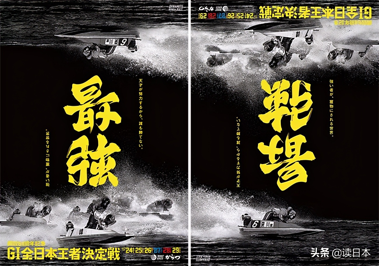 这组海报发布于2017年,是野村一晟为“赛艇G1全日本王者决定赛”设计的。正面看是汉字“最强”,倒过来则变成了“战场”。明明是同样两个字,翻转后却蕴含着截然不同的意义。