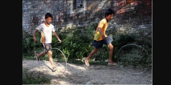 后来有的小朋友图省事拿出家里的废弃自行车轱辘或外胎当环,直接用手推