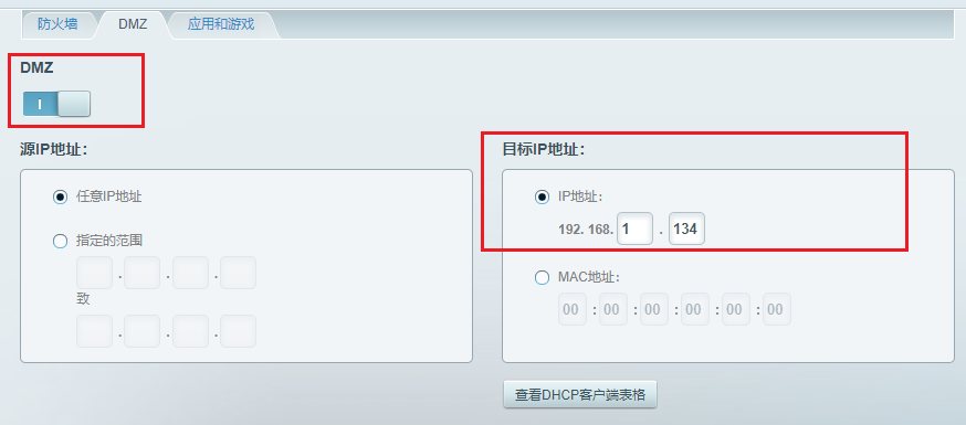 3)关键:路由器设置里面找到DMZ,打开,目标IP设定为你上面绑定那个PC的IP地址